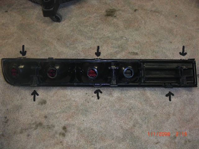 Remove the taillights by removing the 6 long screws. I recommend using a Phillips screwdriver, not an electrical screwdriver, as turning in the wrong direction, or over-tighting these screws, will break the tabs off of the housing that holds the clips. With the taillight assembly removed, now is a good time to disassemble and clean the lenses. Make sure the assembly is warm. I placed mine near a heater to warm them to ensure that I did not break any tabs during disassembly.