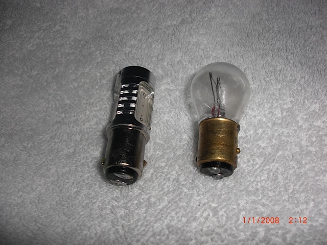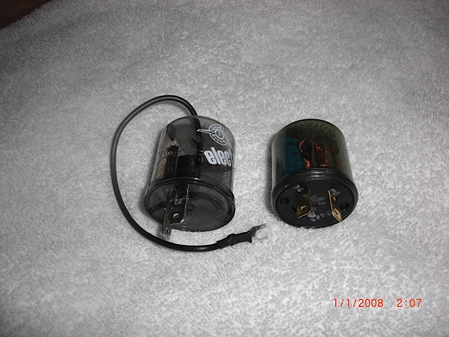 The flasher on the right is the one supplied by TLG. If you use this flasher you must install the load resistors, (1 on each side of the rear turn signal wiring). I did not want to install the load resistors because I was tying to cut down on the load on the battery. I did a search on "led turn siginal flasher" and found the unit on the left. It was from eBay, the part is United Pacific part number 90650. I do belive any of the 2-pin flashers with the wire coming out of the top, (this is a groung wire), will work. Make sure the flasher states "LED compatable." Do not throw the TGL flasher away, remove the Hazard flasher and replace it with the TLG unit.
