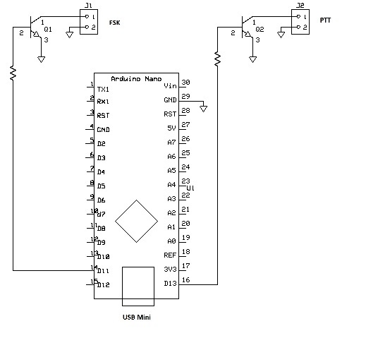 This implementation just uses two switching transistors in open collector configuration. Thus a logical high (5V on most Arduino boards) on D11 will effectively ground the PTT line, and a logical low will disconnect it. The FSK output works the same way, and there is a configuration option to reverse the polarity of this pin (that is, mark can be a logical high or a logical low depending on the requirements of your transceiver). You could, of course, replace the transistors with optoisolators if you wanted. Power is supplied by the USB bus. This really is all there is to the interface: an Arduino board (or compatible), two transistors, and two resistors.