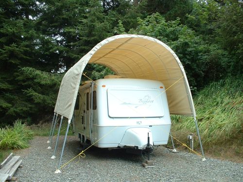 Ok, it's really not a modification to the trailer, just for it. This is one of those transient RV/boat/car shelters that appear in Costco and other outlets every year. It's nominal dimensions are 12' wide, 20' long, and 8' high. Since that's a bit too short in height, I've extended the legs by 4 feet. It so happens that the roof tubing is exactly 1 - 7/8” inside diameter. This is a tight fit for some types of pipe. A better choice, and cheaper, too, is the tubing used as the top rail of chain link fences. Avoid the thicker walled and more expensive post tubing, as you don't need it. Top rail tubing comes in 24 foot lengths but the folks who install fences will typically cut it to length for you. These eight 5' long pieces shown cost a bit under $60. I probably wouldn't do this in an exposed windy area but my location is fairly well sheltered. I put the cross ropes on each end, anyway. It seems to add significant lateral stability to the whole thing.