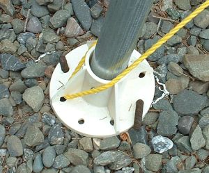 For security against wind trying to lift your "house" off the ground, each base needs to be anchored. These are secured using two 24” pieces of 3/8” rebar, heated and bent over on one end, then driven into the ground through the anchoring holes. Later note: A lid over your trailer is a good idea from the standpoint of sun protection. At least at our location, iIt doesn't keep things any cleaner. I do believe it's better than a tarp, though, because it permits free air circulation and drying.