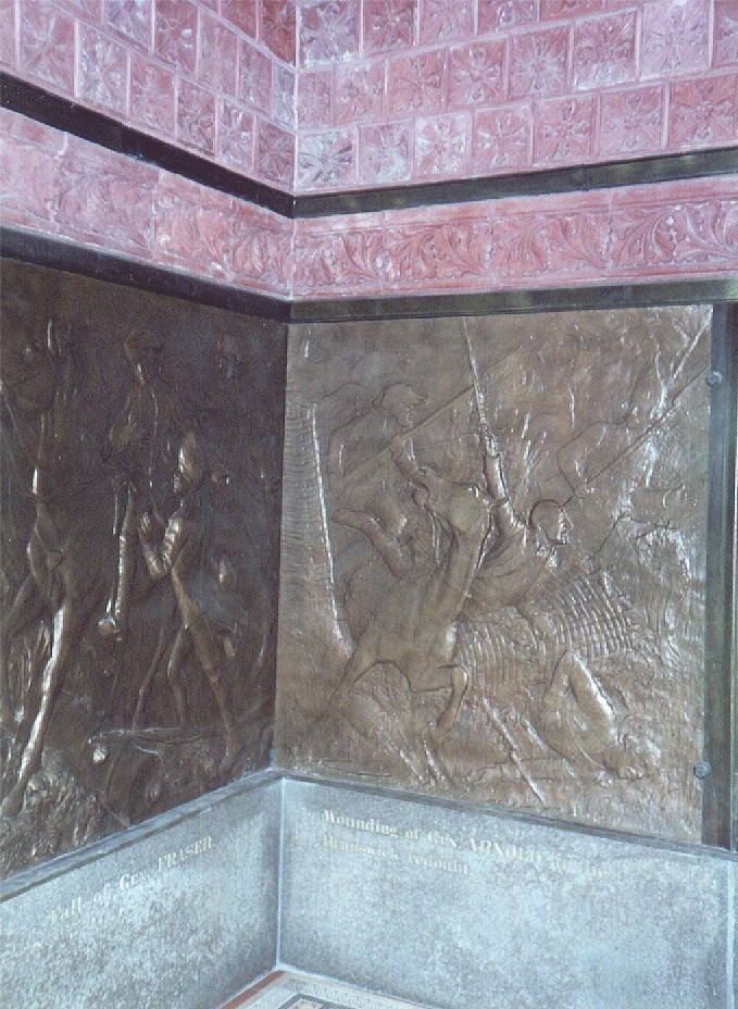 There is an empty space on the fourth side of the monument, where a statue would be located. This space, for General Benedict Arnold, remains empty, because he became a traitor after the battle. Arnold was wounded during the Battle of Saratoga; ironically, had he died from his wounds, he would have been remembered as a leader in the American victory.