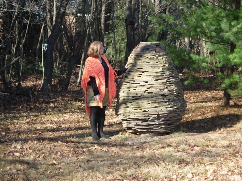 Renee and a stone sculpture that was created by Kenny Braitman's wife.