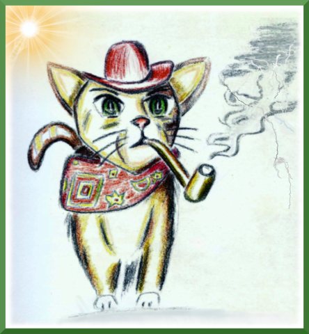 Step 6: Final Version of the Hat and Pipe Cat with the border applied using Filters -> Decor -> Add Border.