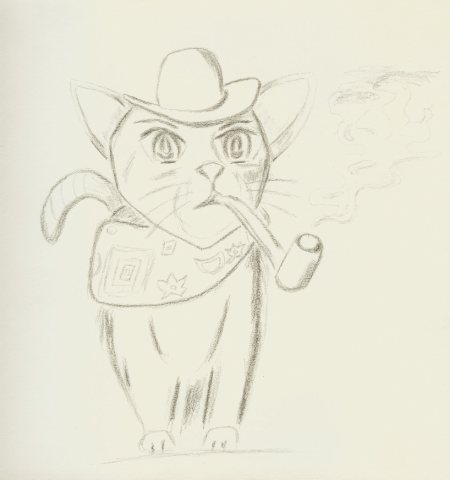 Sketch of the Hat & Pipe Cat in black and white, right before the colored pencils were used.