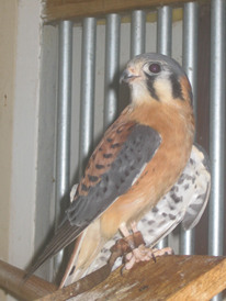 The American Kestrels have sexually dimorphic plumage. The males have bluish gray upper wings and a reddish brown tail. Females have reddish brown upper wings and tail, both of which are narrowly banded with black. Both sexes have a conspicuous black nape and ear patches, and a black "mustache." Kestrels are very vocal in all seasons. When alarmed, the birds utter rapidly, high-pitched "klee" or "killy" notes. Male kestrels' average weight is about 115 grams (4 ounces) while females average about 130 grams (5 ounces). This is the only North American raptor with circular nostrils and a wing length of no more than 207 millimeters (4 inches). The American Kestrel regularly perches on utility wires while larger hawks typically perch on posts or poles. It is often mistakenly identified as a killdeer or mourning dove. Kestrels pump their tail up and down repeatedly right after landing or while perched on utililty wires. They also move their heads up and down ("bop" their heads) as they measure the distance to the prey they are watching. Killdeer and mourning doves do neither of these activities. The ideal habitat for kestrels is open areas with few trees, forest edges near open areas, suburbs, or parks in cities. Kestrels are cavity nesters, depending on woodpeckers to excavate nest sites (especially flickers). They will readily use nest boxes when they are provided. Pair bonding in kestrels is strong and tends to be permanent. Courtship feeding strengthens the bonding and helps ensure the success of the single clutch of 4-5 eggs. Kestrels are generally migratory, however adults breeding in southern states usually do not migrate. Fall migration is mid-August to mid-October and spring migration usually occurs from mid-March to mid-May. Kestrels are perch and aerial hunters. They eat insects, small rodents, songbirds, small amphibians and reptiles, and occasionally small bats. They rarely eat carrion. Most of the kestrel's prey (often large insects) is captured by pinning it to the ground rather than during aerial chases. Kestrels commonly hover when hunting. Kiting may occur for short periods between hovering, especially in strong winds. Extra prey animals may be stored (cached). Competition for nest sites with dominant cavity-nesting species of birds and mammals has had a negative impact on American Kestrel reproductive success. Also, the loss of dead trees for nest sites has probably been a factor. Kestrels are a highly adaptable species and readily acclimate to human-altered habitats, provided suitable nest sites and foraging habitats are available. Kestrels have undoubtedly benefited from the deforestation of much of the eastern United States, which considerably expanded semi-open habitat. Some mortality occurs from illegal shooting, organophosphates pesticides from insect and rodent poisoning and from collisions with vehicles on expressways. |