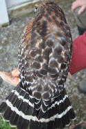(Buteo lineatus)Buteos are the largest group of hawks. They have long, broad and rounded wings and short, broad tails. They are able to soar for hours but they usually hunt by the “sitting and waiting” from a tree or utility pole. They eat a wide variety of prey but mice make up the major part of their diet.The Red-shouldered Hawk is the diurnal version of the Barred Owl. They also live in wooded groves, along streams and swamps. |