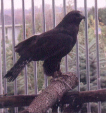 The tarsi of most hawks lack feathers and are scale covered. Each winter Rough-legged Hawks migrate from the Canadian tundra south in loose flocks to southern Canada and the northern United States. Here they spend their winters usually roosting in conifers and feeding on small mammals, birds and carrion. Rough legs hunt from late afternoon to dusk. Each spring Rough-legged Hawks return to the open coniferous forest and tundra of Canada. They produce one brood per year of two to seven eggs. They nest in treetops if available, occasionally on steeply banked slopes but rarely on ground. The nest is made of sticks, grass, weed stalks and excrement. It is lined with grass, down and feathers. It has been noted that rough legs have larger clutches in years of high lemming populations. The male does most or all of the hunting from incubation until fledging of the young. Incubation of the eggs begins as soon as the first egg is laid. The first egg will hatch and be 7-10 days older than the youngest, asynchronous hatching. During years of low lemming populations only the first hatched older chicks survive. Rough legs are inadvertently poisoned by bait intended for mammals and often shot when feeding on road kills in winter. |