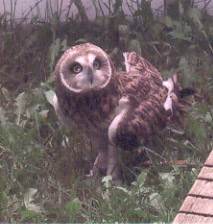 The Short-eared Owl's wings are long, a characteristic of open-country birds, and its flight is buoyant and moth-like. The Short-eared Owl is crepuscular, feeds during the twilight periods, rather than a nocturnal hunter like most owls. The Short-eared Owl shows strong ecological similarities with the Northern Harrier or Marsh Hawk. The Short-eared Owl's outer ear openings are complicated and asymmetrical in structure. The right ear is larger and opens upward while the smaller left ear opens downward. Its calls are subdued and infrequent, apparently the Short-eared Owl is very vulnerable in its open habitat. Short-eared Owls are very protective of their nesting sites. The female may display broken wing behavior and yelp loudly to lead predators away from her nest. Short-eared Owls have been found nesting close enough together to suggest the existence of nesting "colonies," a situation which results from food abundance. They lay four to seven white eggs on the ground by scraping a shallow nest site in sandy soil or on a dry spot. Young hatch asynchronously resulting in sibs variously sized. After young hatch, they are brooded by the female for about 12 days and leave the nest, scattering around in the safety of the vegetation, at the early age of 12-17 days, an adaptation of ground-nesting. The dispersed chicks call to their food-bearing parents by a wing-flapping recognition display, in which they show the white underside of their wings. Fox and mink kill many Short-eared Owl chicks. Short-eared Owls are an engdangered species in New York State. Loss of habitat is the main reason for the population decline of the Short-eared Owls. |