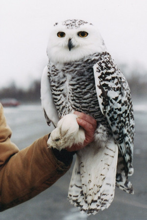 (Bubo scandiacus)Snowy owls are a large and heavy raptor with a wing-span exceeding 5 feet and weighing as much as 4 1/2 pounds. It is North America's heaviest owl. Males can be pure white, while females and juveniles have some dark markings. Most of the body feathers of the female are liberally barred with dark brown or black. Their eyes are golden and they have small feather tufts that are usually not visible. |