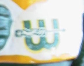 The Blue Base series was created between 1972-1974. They stand 6 inches tall and have a 2 1/4-inch square base. They have no team name on their base but they do sport a decal on their chest. The eyebrows are painted but are not raised as in the HIGH SKATE series. There is also a black puck painted on the base; just in front of their hockey stick. This series had a blue oval shaped sticker on the bottom of the base that read "Made in Japan". They have very large hockey gloves in comparison with the other molds. The Blue Base dolls used a straight spring that had 8 - 10 coils. This series had different distributors who were located in the same city as the teams. The boxes for some of the dolls list= CPSE LTD. (Cleveland Crusaders), T.J.B. ENTERPRISES (Boston Bruins) & NANCO (NANCY SALES CO. INC. ) (New England Whalers). See picture below for a NANCO sticker that was put on the bottom of the New England Whalers doll bases. The box for the Blue Base series dolls had a colored sticker that showed a hockey "Mascot" & team name. The side of the box had a white sticker similar to the one used on the MINI boxes. It listed team name, 1 PC and "Made in Japan". (see 2 examples of boxes below)