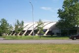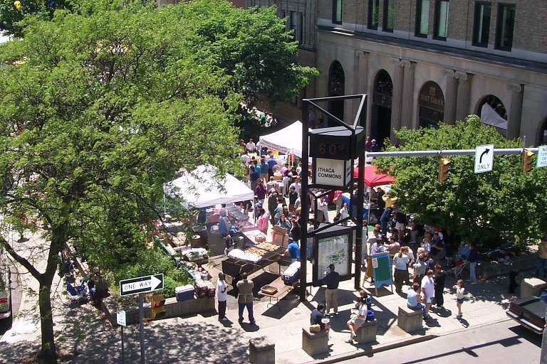 North side of the city with Ithaca High School, Cayuga Inlet, the Ithaca Farmers' Market and Cass Park in the distance |