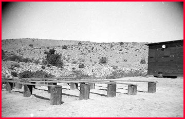 Entertainment at the early camp was somewhat limited. This was a unique walk-in theater with limited seating and natural air conditioning. That is the projection booth on the right. The screen was off camera to the left. Rain checks were seldom issued in the dry desert. Someone would probably cook up a big batch of popcorn and beer was almost certainly available. If you have more info, please contact me.
