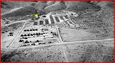 By January 1955 the camp was rapidly growing. Metal pre-fab Butler Buildings replaced most of the tents where the men lived. However, tents were still in use in the motor pool (bottom of photo) and the admin. area at the top. The mess hall was completed and is marked with a yellow dot. The long building below and slightly to the left is the 42-head shower facility, using water trucked in from Carrizozo. Several eight-hole outhouses were spaced around the camp. Many worn out old travel trailers were parked at the top right for use as BOQs. They were worse than the old tents. The road in the foreground goes to the front gate to the right, down range to the left. A baseball diamond is at the intersection of that road and "D" Ave. (really!) going up the hill in the center. All roads were little more than trails but they were named either a street or avenue. Cartographers name everything.