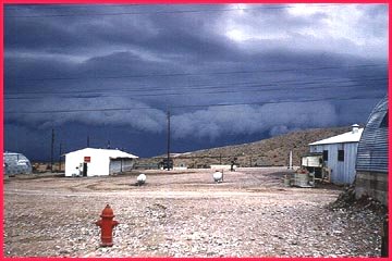Alan Graham was the Ansel Adams of Red Canyon. His photos of the landscape and camp are absolutely stunning. Here he captured a squall line moving from the south toward camp with its dark ominous cloud front. When these things hit, anything not tied down was lost. Strong gusty winds whipped tents and men alike. Metal buildings were much sturdier and usually withstood the blast. The long shiny building above the fireplug is the original 42-head shower facility. Water trucks from Carrizozo would attach a hose to the building and pump in heated water for the showers. Often the water supply ran out before you finished showering. A water well was drilled southwest of the camp but the water was too alkali to drink or shower in. Even lye soap would not work in that "gyp" water. It was used to charge the fire hydrants and to flush toilets in the new latrine inside the Quonset hut at upper left. The flat metal building at upper right looks like the PX. Propane has replaced some of the kerosene fired devices; two tanks are seen here.