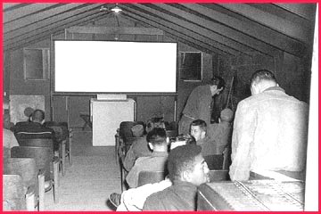 The Picture Show was one of the favorite places in the camp. Always a newly released film, complete with Movietone News and a cartoon, there was usually standing room only. The cost, I believe, was a quarter, and I can't remember if there was popcorn available. The theater was a blacked out Butler Building. After I had been at the camp awhile, I was sent down to Ft. Bliss to get an operator's permit for a 16 MM projector. Projectionist School lasted half a day. There were records to be kept of how many times the movie was shown and how many people attended each showing. So many things would go wrong with the projector. The film would lose its loop, causing the dreaded 'meltdown'. The audio would get out of sync with the video, delaying the spoken words until after the actors' lips quit moving. The worst case was for one of the reels to come off the projector while it was running, spilling about a quarter of a mile of film onto the dirty floor. I hated meltdowns because everyone would start yelling and booing, which made me nervous and delayed the splicing of the film even more. When I began projecting film at the theater, we had only one projector. At the end of each reel I had to turn up the lights and change reels, which did not create a really good movie theater atmosphere. One benefit though, as projectionist I got in free.