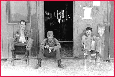 Commo troops (L-R) MacDonald, Billy Horner and Raven Hensley escape the confine of the barracks by sitting on the front stoop, such as it is. Billy is rolling a smoke from a sack of Bull Durham. The yellowed, sand blasted plastic windows inside were sealed shut so there was little fresh air circulating through the room. It was not uncommon to drag one's bunk outside to sleep during the summer. It was a bit cooler.