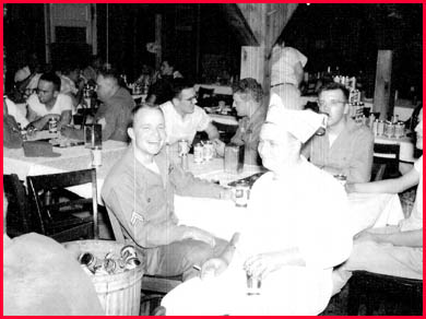 Some occasions called for a mass party in the mess hall. Perhaps one of the camp's officers got promoted or we passed an important milestone or inspection. The main feature was free beer for everyone in the camp. Herman Hartley, the corporal with the great smile facing the camera, was in charge of the Military Police who provided security for Red Canyon. He sent me this photo for scanning around 1997. It survived several computer crashes, two new computers and I just rediscovered it last week. I had never examined it closely until now and to my surprise, the guy in the white T-shirt with his arms folded, to the left of and behind Herman, looks very much like me. I know of no other photo of me at the camp. The cook next to Herman is Smitty, who also had a part time job as cook for a tavern in Carrizozo. Red Canyon cooks were the greatest. Working in a hot, tiny kitchen with very limited equipment and stores, they turned out excellent chow day after day.
