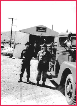 The main camp fire department was between the mess hall and supply, sort of in front of the chapel. I get asked why we needed a fire department out in the middle of the desert. Listen, these guys had their hands full all of the time. In the early days tents caught fire regularly. The gasoline fired stoves in the mess hall were a hazard as were the kerosene heaters in each barracks. Down range was where most of the action took place. When a Nike launched, its booster expelled chunks of burning solid propellant, which set the tall dry grass on fire.