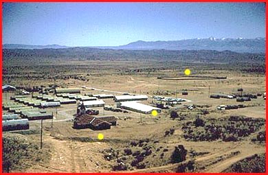 This is a really great view of the south half of the camp. From left to right, yellow dots mark the chapel, mess hall and ballpark. Joe was standing knee deep in rattlesnake country when he snapped this photo!