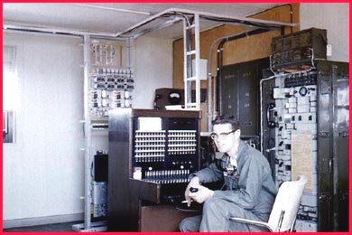 Commo man Alan Graham is working the switch today. These units were also called a PBX because they were a Patch Board eXchange. In front of Alan is the patchboard, 30 jacks for incoming calls and a smaller number for outgoing. On the table where his arm rests are the patch cord plugs. When a call came in, a buzzer sounded and a white "eyelid" dropped in a window above the active jack. Alan would insert a patch cord in that jack and say "Red Canyon Switch." The caller would say where he wanted to connect to and Alan would plug another patch cord into that jack, and forward ring that number. Most of the telephones at Red Canyon did not have dialers on them. Many were EE-8 phones with a crank handle on the side to ring the switch. Each Nike Set had a similar system at both the Battery Control Van and launch Control Trailer.