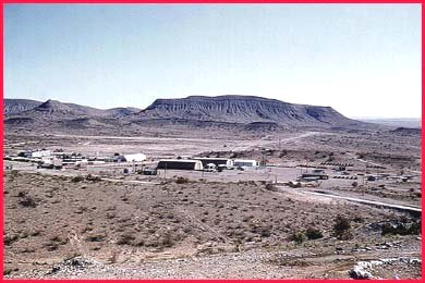View from the Commo Shack of the Ordnance Area, midway between the main camp and down range. The main camp is beyond the mesa, far from this dangerous area. You can see the gravel road snaking down Commo Hill and entering the Ordnance Area. This was the first area to have the Quonset Huts and they were here from the beginning. On the right you can see Nike booster shipping crates neatly arranged. On the slope above them looks like Nike Missile shipping containers. This is where all the missile components came together.