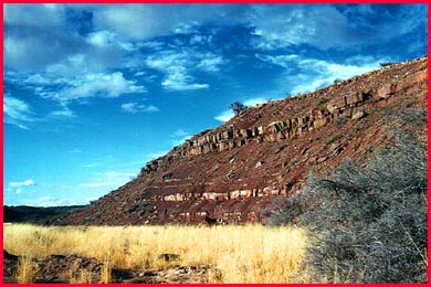What a photo! Look at that beautiful red rock cliff! It was from an area like this that the men quarried the red rock to build the chapel. And it was that tall dry grass which so frequently caught fire downrange.