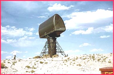 Looking like a giant bathtub, this radar rotates continuously, searching for anything flying within its range, about 100 miles. The electronics, modulator, magnetron, etc. are inside the large cylindrical base. A waveguide feeds the microwave signals both to and from the rotating antenna. Strong legs brace and steady the antenna against the incessant desert wind. Electronic cables lead from the left side of the base and connect to the Battery Control (BC) Van.
