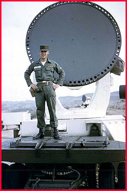 During ASP, Spec-3 Cox of C Btry, 739th AAA Msl Bn, Bristol, RI, poses atop the Missile Tracking Radar. The Target Tracking Radar is visible through the yoke, while a part of the acquisition radar shows on the right. The radar’s camera/boresight scope mount is on the right side of the radar inside a protective canvas cover. Note: Standing in front of radars while they are operating is not recommended.