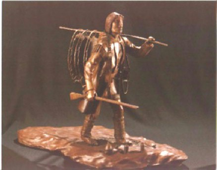 (21 3/4" high x 13 1/2 wide x 28" long; approx weight 70-80 lbs.) This bronze sculpture depicts a Metis' trapper of the 1800-1820 period running his trap line. The offspring of a former French Canadian Voyager and an Ojibwa Indian woman is making his way on snowshoes along a beaver stream. He has checked his traps and rather than carry the carcasses of the three adult beavers, weighing an average of 30-40 pounds each, he has skinned and laced them into stretching and drying frames. Two of his five traps did not contain beaver, so he has removed them and will locate them in a more productive section of the stream. The average trapper carried or was assigned five to six , five pound hand forged traps. The gun he carries in his right hand is a 24 ga. smooth bore, called an Indian trade gun. These guns, made especially for the Indian trade, all had a cast brass dragon side plate opposite the lock side of the gun, and were capable of shooting both buck shot or ball. This versatility enabled the taking of a wide variety of game. The snowshoes are typical of the Ojibwa of the Great Lakes region and Western Canada, even into the Western U.S. A deep snow has blanketed the earth and a period of severe cold and high winds have crusted the snow so that the trappers weight, distributed by the snowshoes, does not cause hem to sink into the snow as would occur on fresh snow. His coat is made from a blanket and was commonly called a capote, although "capote" is french and refers to the hook which in this case is made as a part of his coat. The Hudson Bay Trapper is a limited addition of 15 bronze castings. Craig can be contacted on prices.