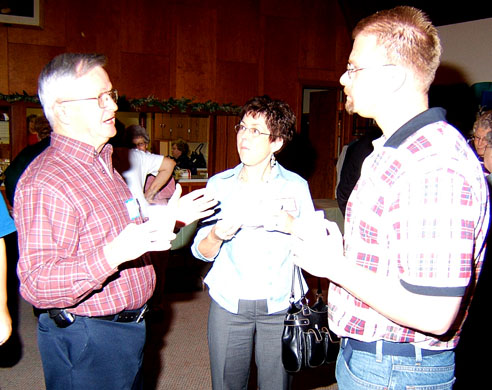 Pastor Lang and Paul Harrison speaking to the attendees.