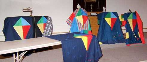 Our Kite Quilt Project is off to a good start, on the left, and on the right is our traveling display we take to churches on Sundays.