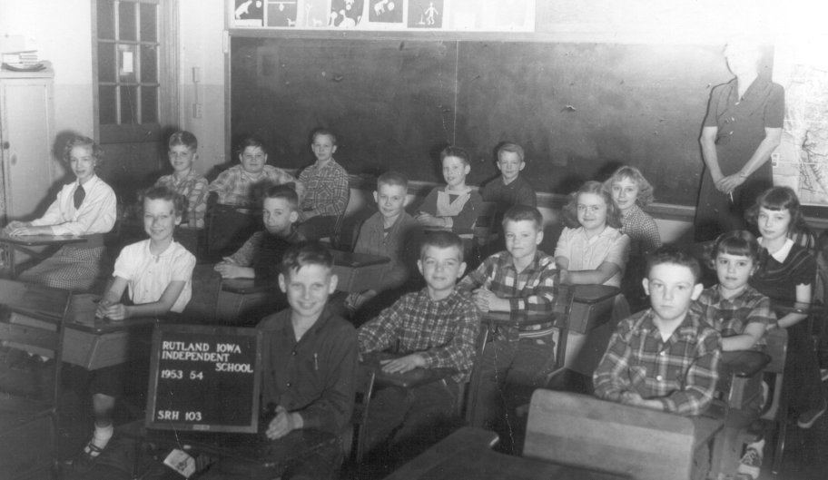 3rd-5th grades, 1953-54, Rutland, Iowa Nearest row: (front to back) Jimmy Cran, Suzanne Coffin, Jean Oxborrow Second row: Andy Booheister, Doug Fish, Mike Munson, Ruth Fridolfson, Shirley Carlson Third row: Dianne Thorn, Mike Braby, Ron Anderson, Steve Munson, Chris Albertson Fourth row: Rachel Lewis, Roger Coltvet, Gilbert Hood, Jim Mayall Standing: Ruth Barrett, teacher Back to photos page |