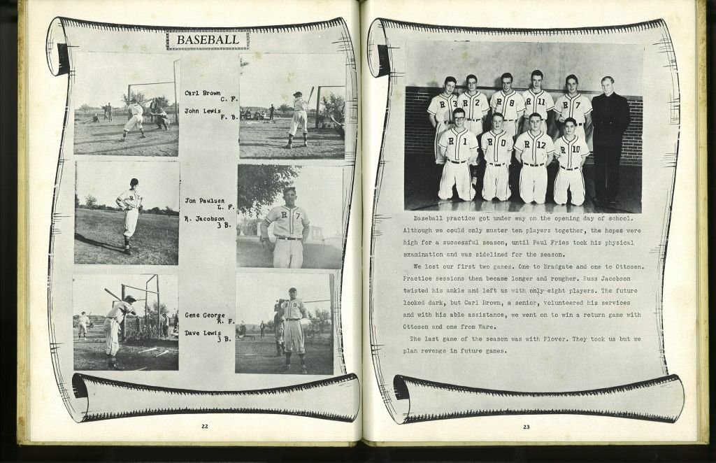 Names on above pages: Carl Brown, John Lewis, John Pauson, R. Jacobson, Gene George, Dave Lewis Team picture, back row: Gene George, John Lewis, David Lewis, Ernest Anderson, Russ Jacobson; front row: Dick Jergens, Larry Braby, Eugene Asa, Jon Paulson