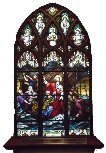 Scene is apostles in boat Jesus calming the waters.