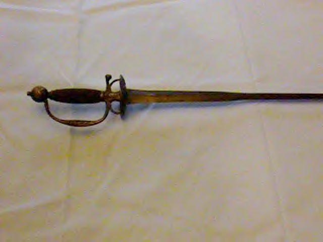 Pictured here are two European Court Small Swords of the mid-18th Century. The one to the left has a 31 1/2" hollow ground blade with a brass hilt that is copper wired. It has a double shell guard decorated with eagles and trophies and an eagle on the pommel. The one to the right is similar, but has a 32" colichemarde blade that is flattened and diamond sectioned. It starts out being wide at the hilt end and then quickly tapers to a rapier type blade. These type blades were popular with French and Indian War period officers, and Washington had a colichemarde bladed sword as well. |