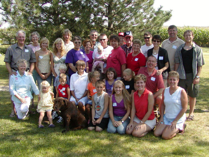 | Standing, L to R: Kim and Susan (kneeling) Stover, Connie (Mrs. Rod) Stover, Hanna Stover, Melissa Stover Holmlund, Eric Holmlund, Kathlene Rodehorst Hanna, Lisa Feikert Prascher (mother), Rod Stover, Shelby Prascher (baby), Richard Prascher (father), Bonita 'Nita' Stover Farr, Tom Farr, Dick and Glenda Stover Prascher, Lance Kreutzer, Althea (Mrs. Todd) Stover, Kerwin and Micah Stover. Middle, Seated: Emmanuelle (Emmy) and Josiah (standing) Holmlund, Forman (lab) Stover, McKane (in red - the Farr's grandson), Margaret Rodehorst, Madison (in orange - the Farr's granddaughter), Kaitlyn Kreutzer, Hannah Garringer, Todd Stover Front, kneeling: Garret Kreutzer, Sarah Garringer, Dana Prascher Kreutzer, Paige Prascher Garringer. Not pictured: Dan Garringer (photographer), Marge Stover (broken hip), Derry Stover (left early), Craig Stover and family (arrived later) |