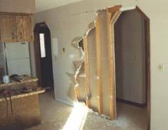 The functionless wall was replaced by 13' headers to echo the hexagonal theme. All the trim carefully preserved for later. |