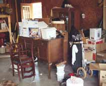 but fell for a used Ford Ranger. Whoops, there goes the $$ for the downstairs bathroom. The toughest item was the washing machine that Rod hauled from Colorado. Nephew Derry Stover helped on many quick trips from the town home. Laundry appliances had to wait for flooring. Kitchen appliances had been moved to the dining room to make way for flooring, but then stayed there awaiting new kitchen counter tops, which were delayed yet another week. In the meantime, the garage stored the dining room furniture (and gobs of other stuff). Stuff. Gobs of stuff. Some still packed from Connie's move 7 years ago. And more stuff of Rod's that had been stacked in the town home garage. Garage sale coming up, even if we have to move it back. |