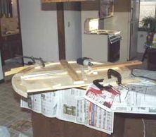 | Finally ! After SEVEN WEEKS of commuting and toil, we stayed over night ! Not that we had 'moved'.. just anxious to live here. With no kitchen and no dining room (still awaiting formica), it was a bit like camping. The little gas grille and a spare microwave oven provided welcome relief from fast food. |