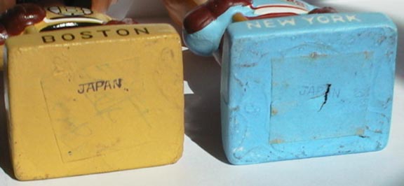 Please notice = * This pictures shows the difference between a FAKE N.Y. Rangers mini (outside dolls) and the original doll. The 2 outside dolls have the initials "KDT" stamped on the base. He also restamped the bases with a "JAPAN" stamp that is smaller than on the original doll.