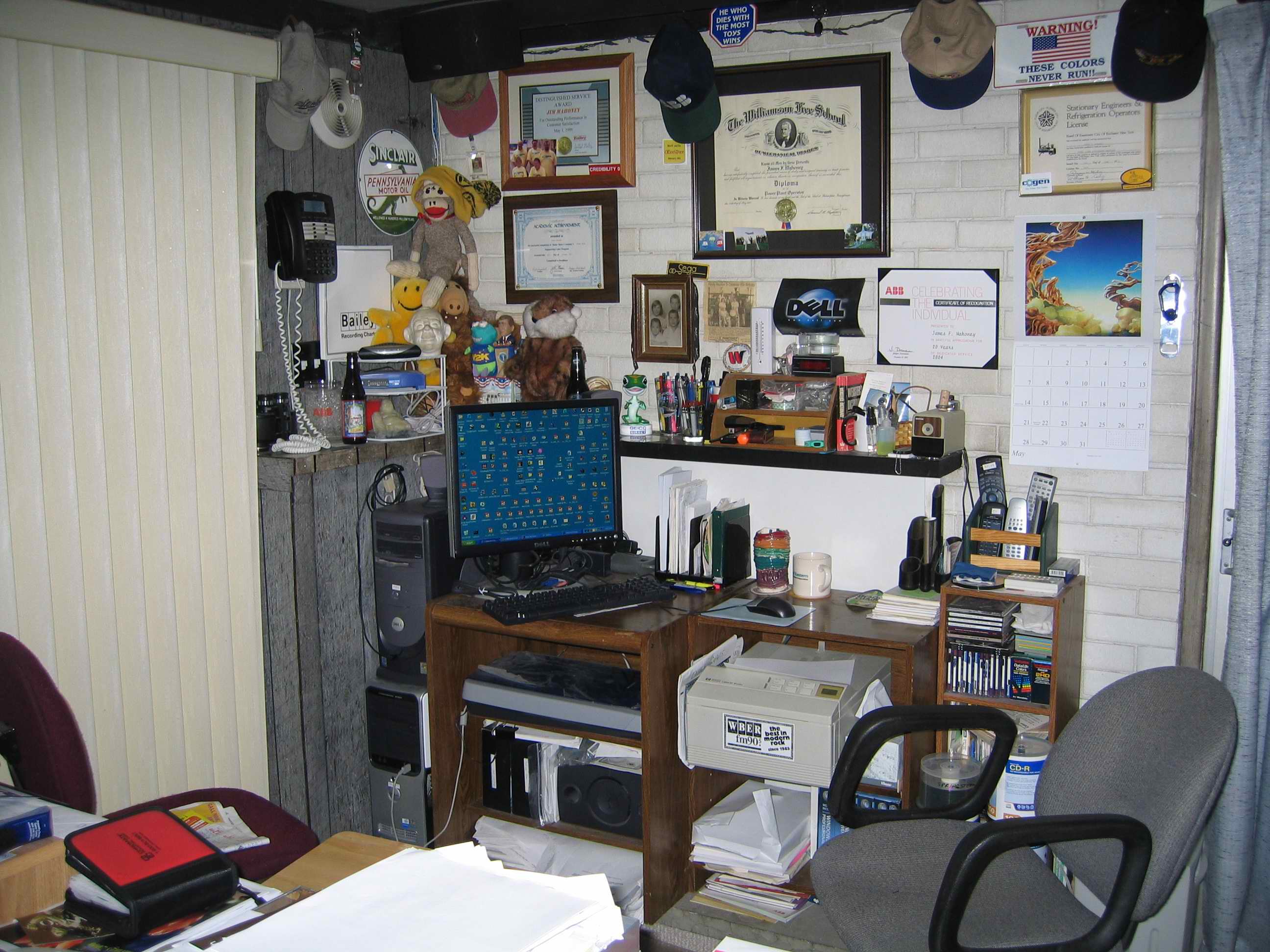 The room has been set up to include a sitting area to relax in and office space that is also the hub of a small home computer network. The main machine is against the wall; a couple more sit across from it, sharing the monitor and keyboard to conserve space. Network cables snake through the ceiling and branch out to connect computers in the bedrooms above. All tie to the internet through a router and firewall with a speedy DSL connection. The control center opens out to the enclosed sunroom and patio (under the deck) , both of which look out onto our spacious backyard.