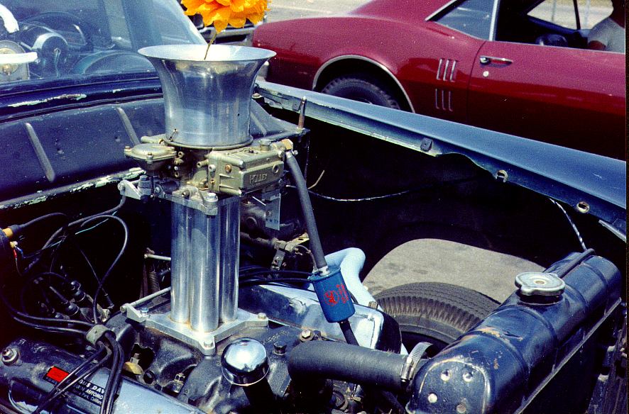 I raced a 1955 ford with a 292 cubic inch engine with a single four barrel carburetor, a Pontiac rear end with 5.13 gears. This was just a normal weekend drag car until I met a gentleman by the name of Gus Davis. He knew more tricks to do to this engine than anyone I knew. He ground a custom cam, and tried goofy things like what you see here. Not all of them worked but there was lots of low-end torque for this one. The last few years of racing, the car ran in the low 13's at 110 MPH, and in 1966 it put away seven Chevys at the Winter Nationals at Irwindale.