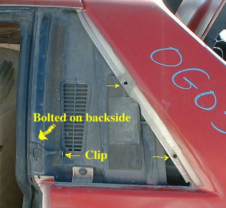 Have you ever wondered how that sail panel is held to the body? The picture here to the right shows an 85 SE with the panel removed. I recommend you remove it if you are going to paint your car or if you need to repaint the panel.