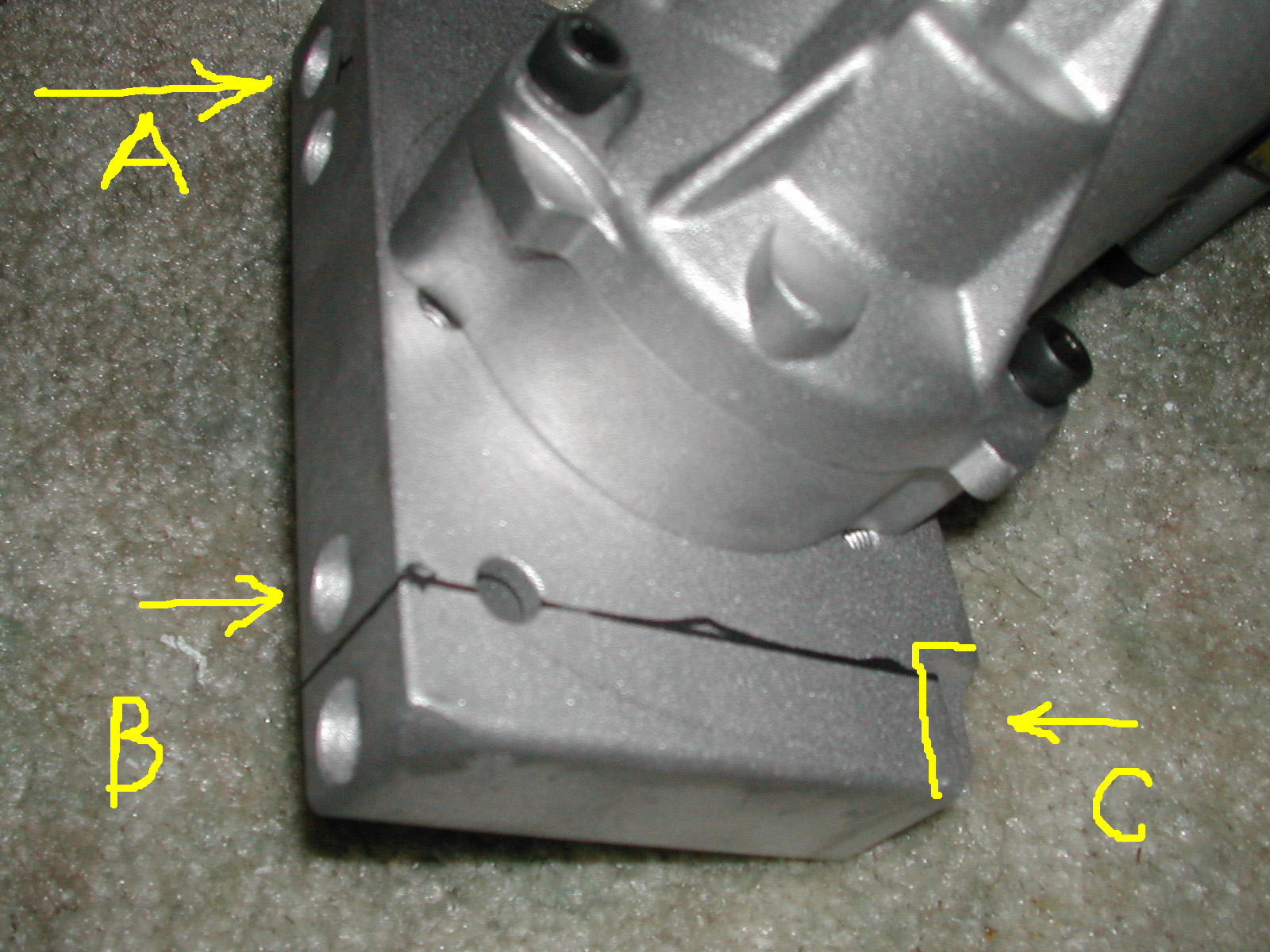 By removing the area "B" piece, this will allow the starter to be moved closer to the engine block and the starter pinon will engage the flywheel correctly. We will use the holes marked "A" to mount the starter to the engine block. But before you do any machine work (I am now going to total confuse you) remove the 3 allen head screws and rotate the mount 180 degrees. Now machine off area "B". This is because we are going to position the starter at a slightly different angle so that the starter's solenoid is in a better position.