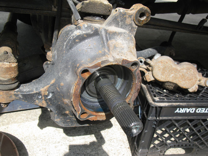 First, jack up the truck and remove the tire. Then remove the brake caliper, pads, bracket, and then the rotor.