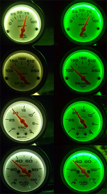 Well, to put it mildly, I was unhappy with the standard illumination of the Auto Meter Phantom gauges. Not only did the four gauges have different levels of brightness, but they weren't all the same shade of green (due to the brightness difference, I assume).