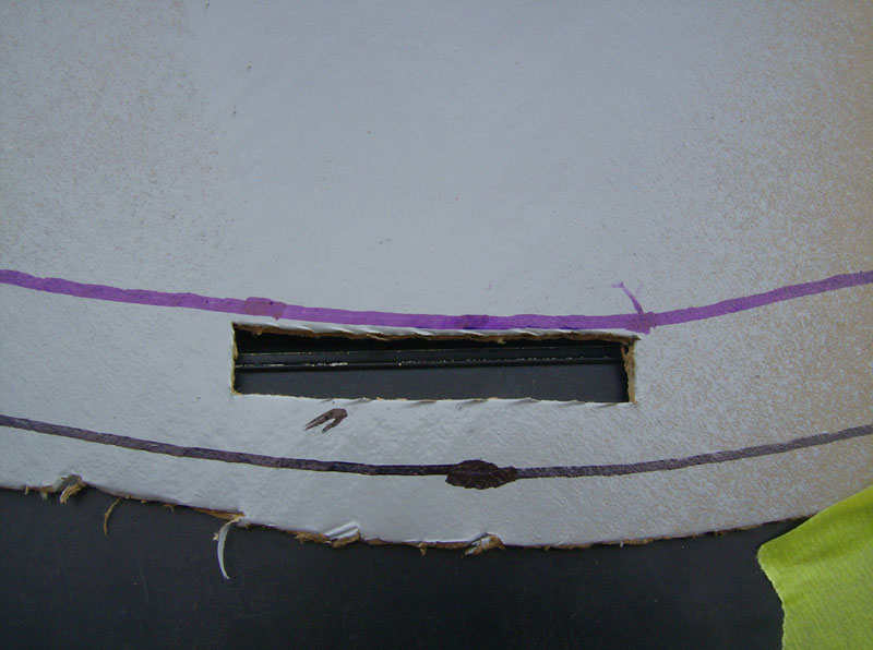 Now that I have the wiper arm shortened, and a 12" wiper blade, I got a different piece of cardboard and made a new version of the template. The black line represents the pattern with the original 14" wiper blade and the purple line represents the pattern with a 12" wiper blade. You can also see three "windows" I cut in the template so I could see through it when sizing it up on the truck.