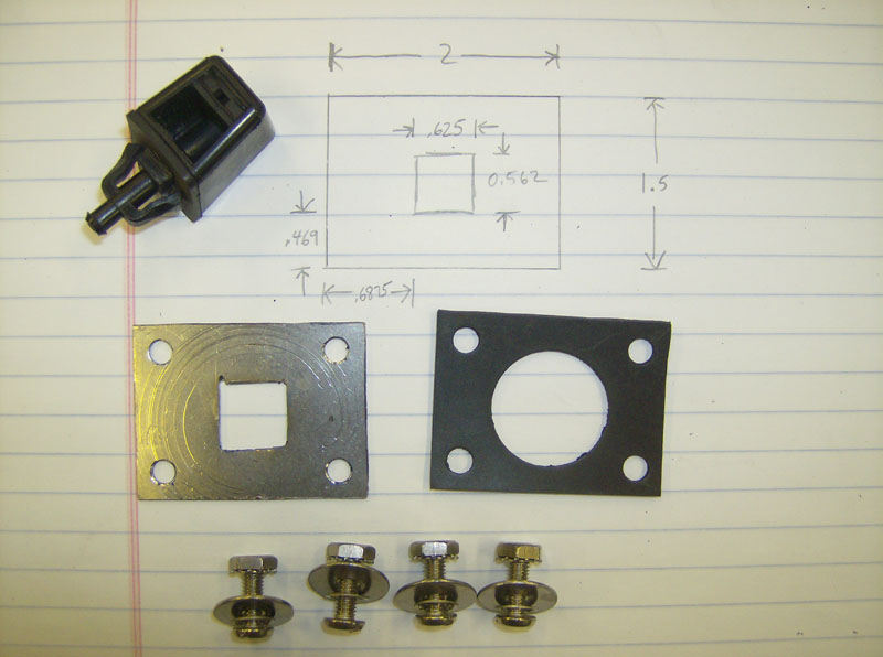 I had to come up with a way to mount the washer nozzle because its designed to mount through sheet metal, which is much thinner than the fiberglass of my truck cap. I just cut a 2" x 1-1/2" x 1/16" thick piece of stainless and cut out the appropriate hole for the nozzle to mount to. I also cut a rubber gasket to seal behind the adapter plate.