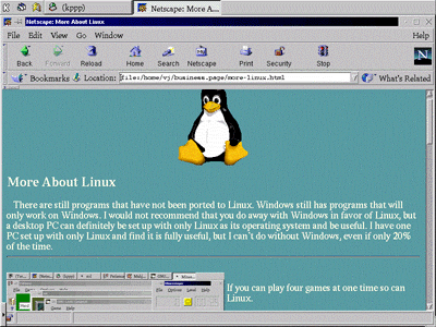 If you look at the top of this image you can see that I also have Netscape, a terminal window, and the dialup utility running in the background. That doesn't crash the AMD 486, 120MHz, with 32 Mb RAM that this is running on. Almost forgot, add the snapshot applet. That's eight programs running at once on a 486. No problem because Linux is a real multitasking OS.